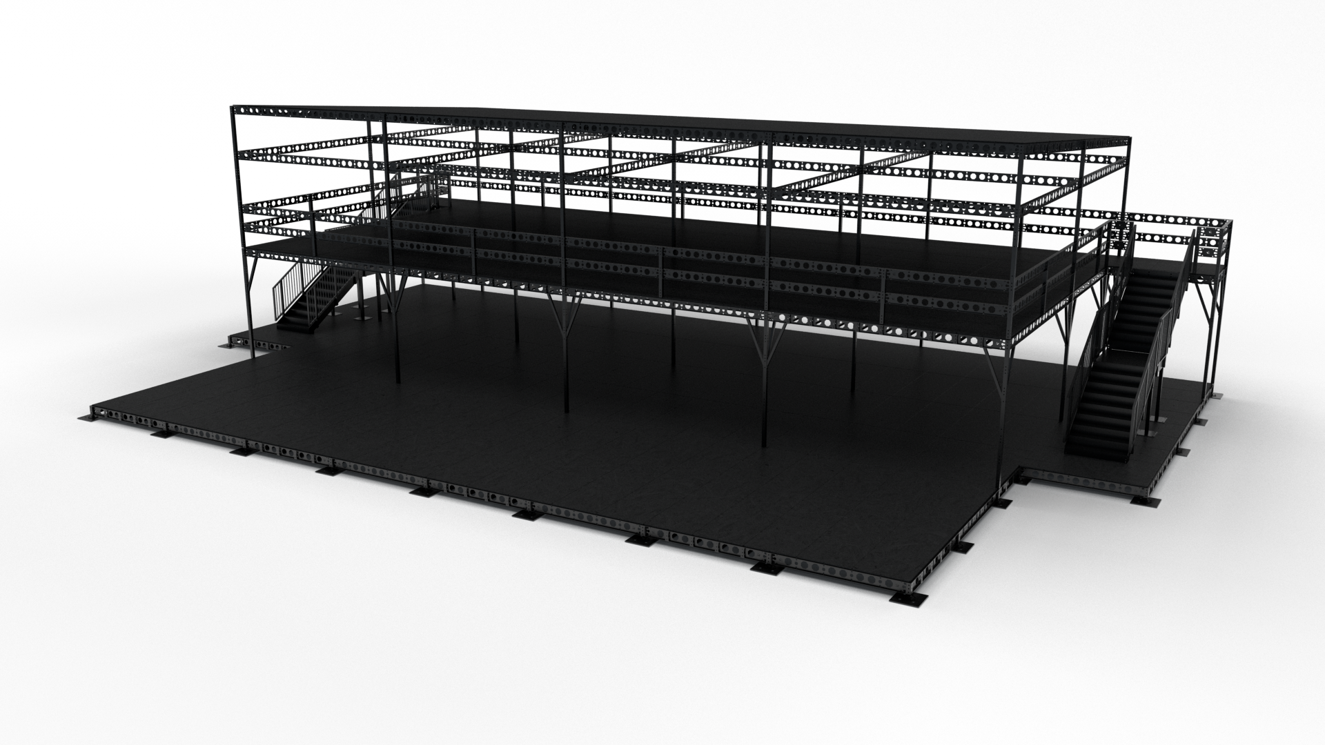 With column supports at 2.5m intervals we regularly build mezzanines up to 5kN/m2 loads, which is the maximum required for viewing platforms and crowded areas. This allows for free flowing movements of people at your events. The most common mezzanine we build is for hospitality and lounge areas. These have column supports underneath at 5.0m intervals and are built to 3kN/m2 live loads.